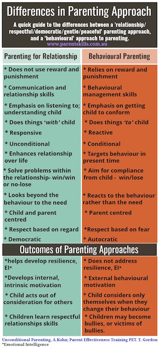 The parenting stance taken in P.E.T. differs markedly from that of behavioural parenting courses. The emphasis in P.E.T. is to improve relationships, and help children develop self-discipline where there is no use of reward or punishment. In contrast, behavioural courses rely on reward and punishment to control child behaviour (a form of external discipline).